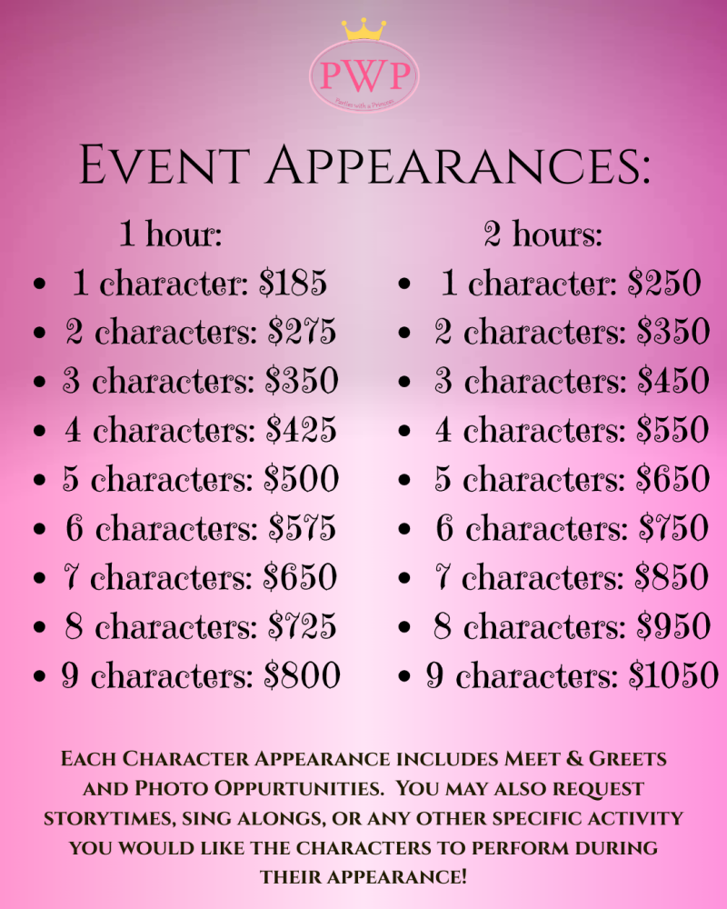 - Cash/check made out to "Parties with a Princess" mailed to 415 Park Row, Bowling Green, Ky, 42101)